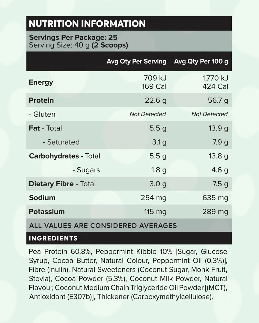 Rich and creamy Choc Mint Custard Plant Protein Powder, with mint crisp pieces.