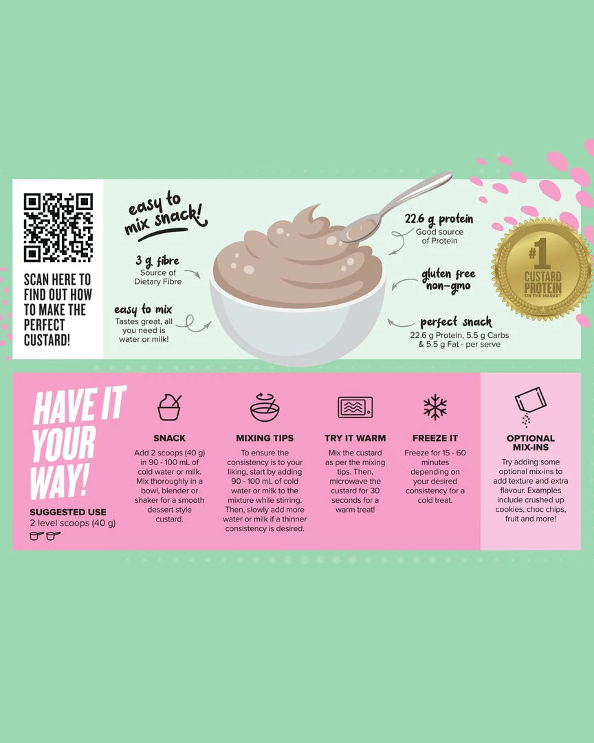 Just add water or your preferred milk and you will have ready-to-eat smooth custard with the added benefits of plant protein and fibre. Great on its own, or get creative and mix in your favourite fruits, nuts or granola for a little added crunch. It’s the ultimate natural protein snack or vegan friendly treat to satisfy those sweet tooth cravings.