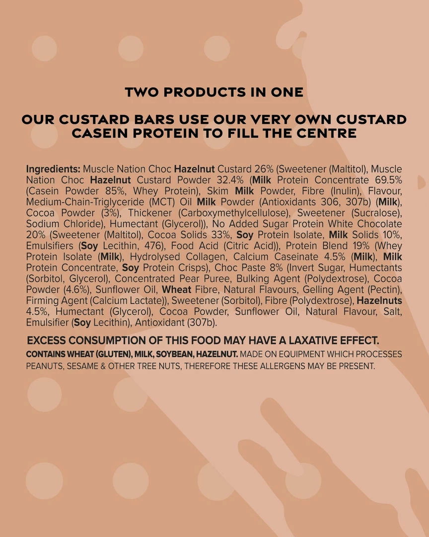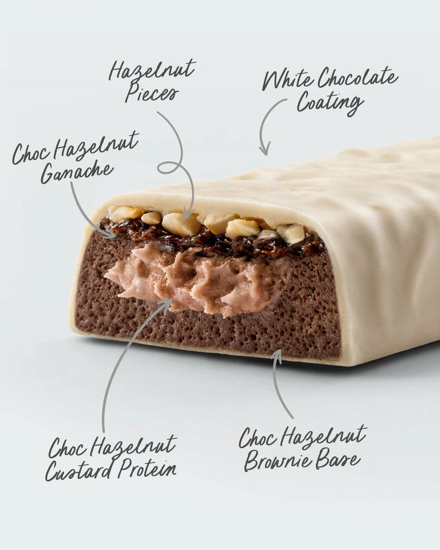 A mouth watering protein bar featuring a smooth chocolate hazelnut custard layer with an extra layer of gooey chocolate, sprinkled with hazelnuts and coated in a lush layer of white chocolate. It’s the ultimate protein packed snack made with our renowned Custard Protein.