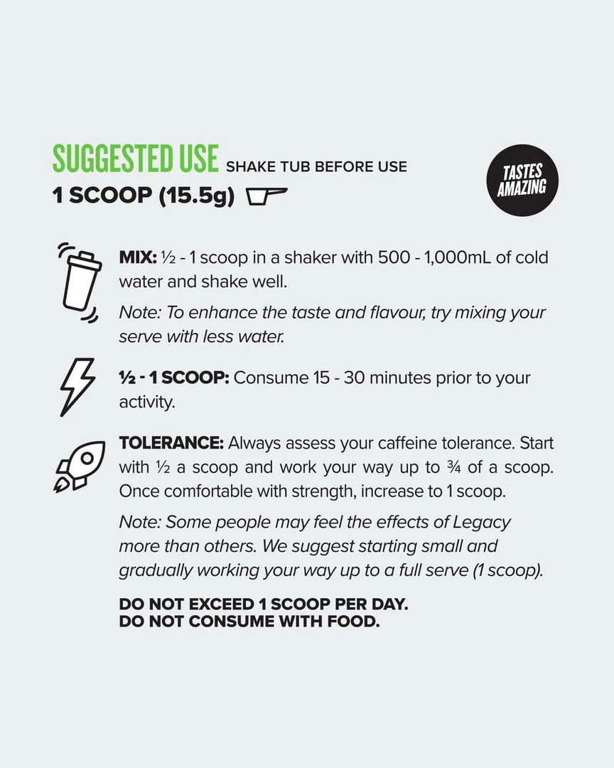 Note: Some people may feel the effects of Legacy more than others. We suggest starting small and gradually working your way up to 1 scoop (1 serve).