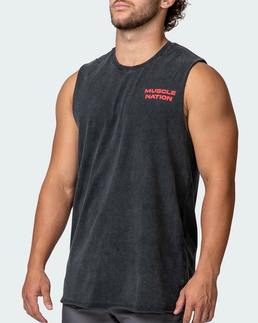 Details include a distressed acid wash base and bold Muscle Nation branding.