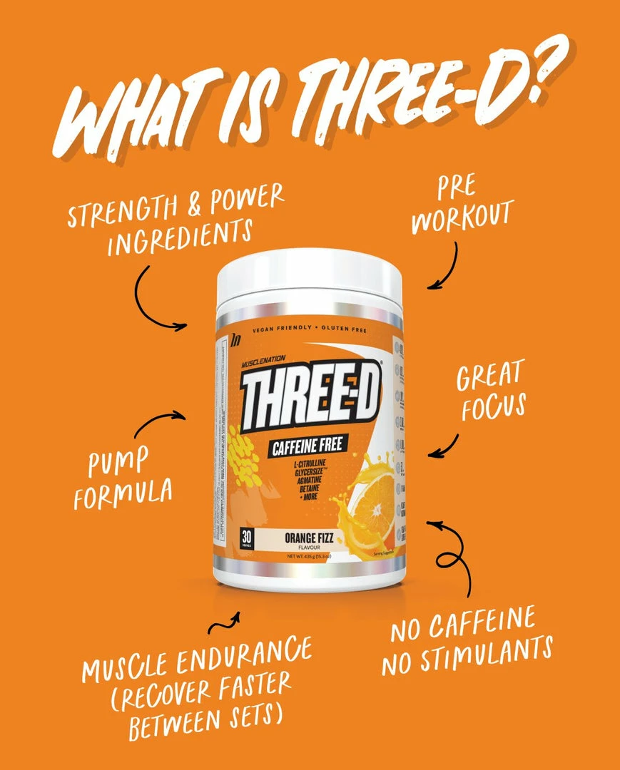 Three-D is our caffeine free pre-workout for anyone who wants that extra push and pump, but without the jitters and anxiety.