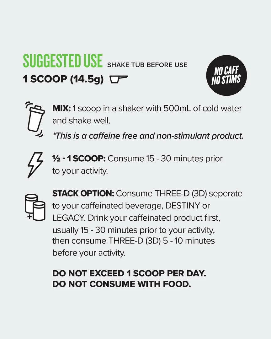 Three-D is our caffeine free pre-workout for anyone who wants that extra push and pump, but without the jitters and anxiety.