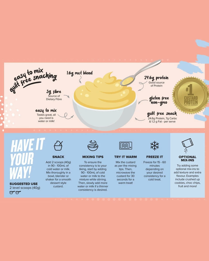 Our Custard Casein Protein is quick and easy to make, all you need is water or milk! With a smooth and creamy consistency, our Custard Protein is the perfect breakfast, snack or a night time treat. Our Custard Protein tastes amazing and is a good source of protein.