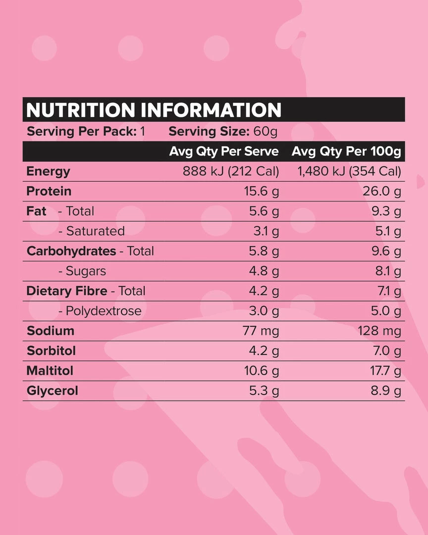 A mouth watering protein bar featuring a smooth white chocolate custard layer with an extra layer of gooey raspberry jam, sprinkled with chewy berry bites and coated in a lush layer of white chocolate. It’s the ultimate protein packed snack made with our renowned Custard Protein.