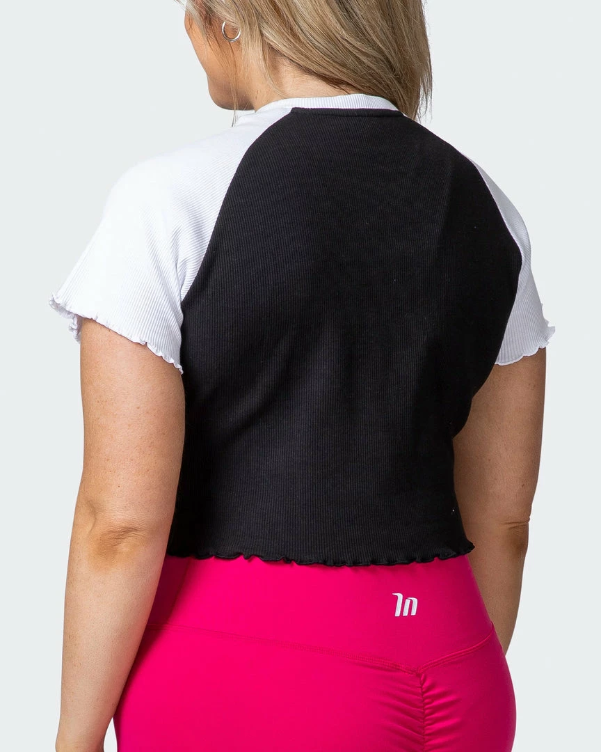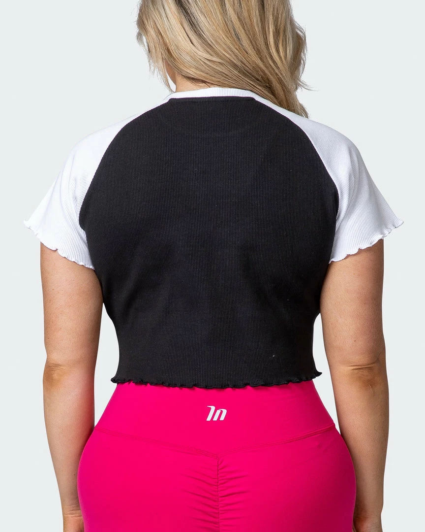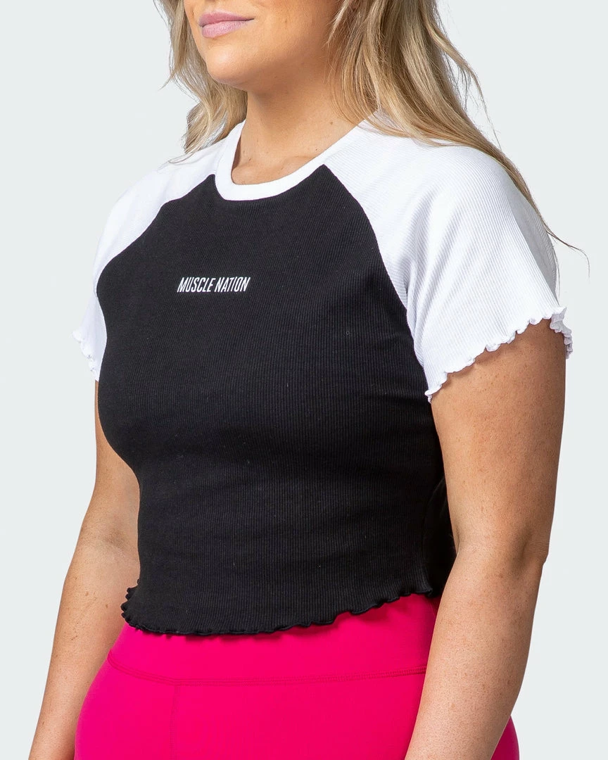 Featuring a super cute lettuce sleeve and hemline design, cropped length and Easy Wear Cotton Feel Rib Fabric.