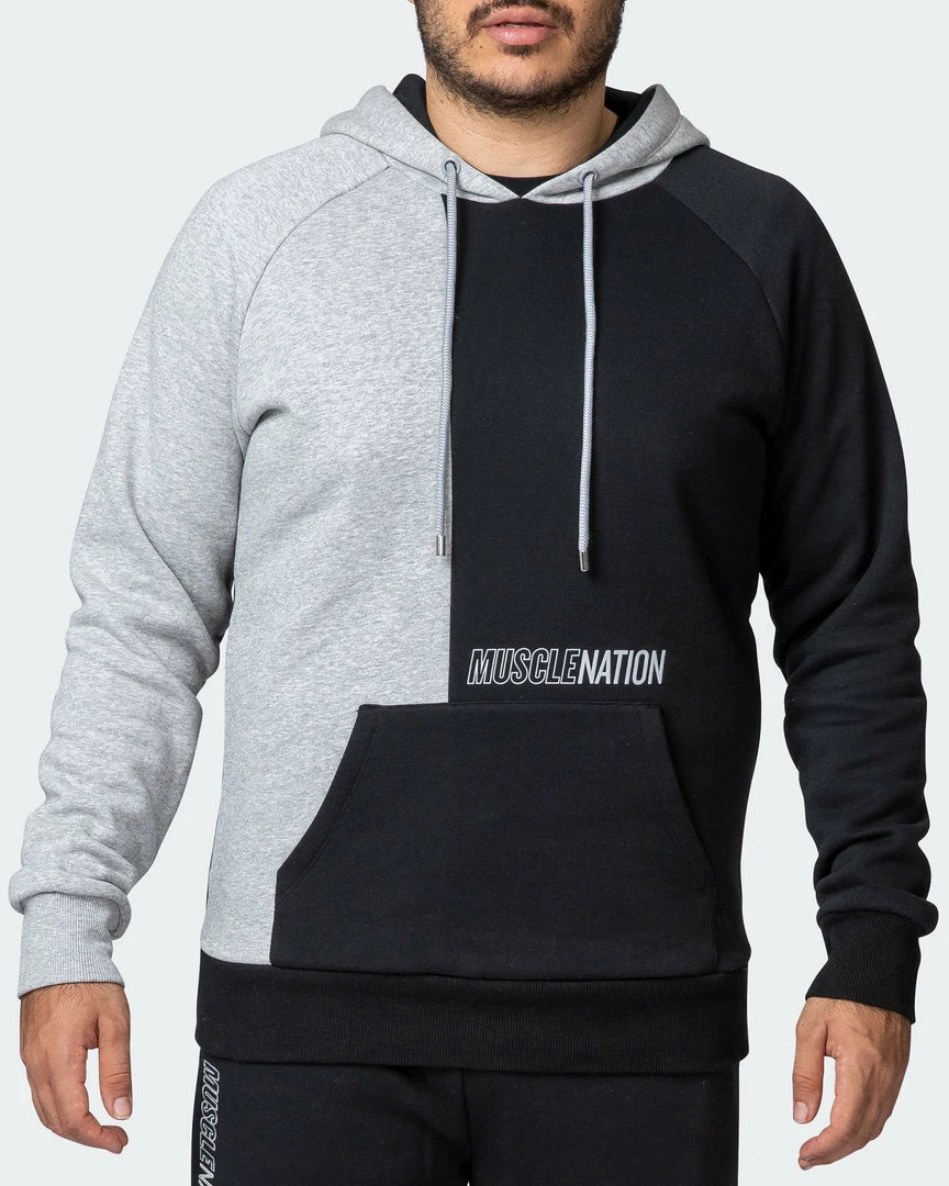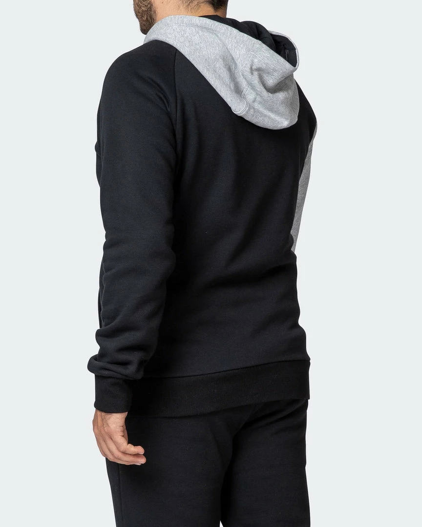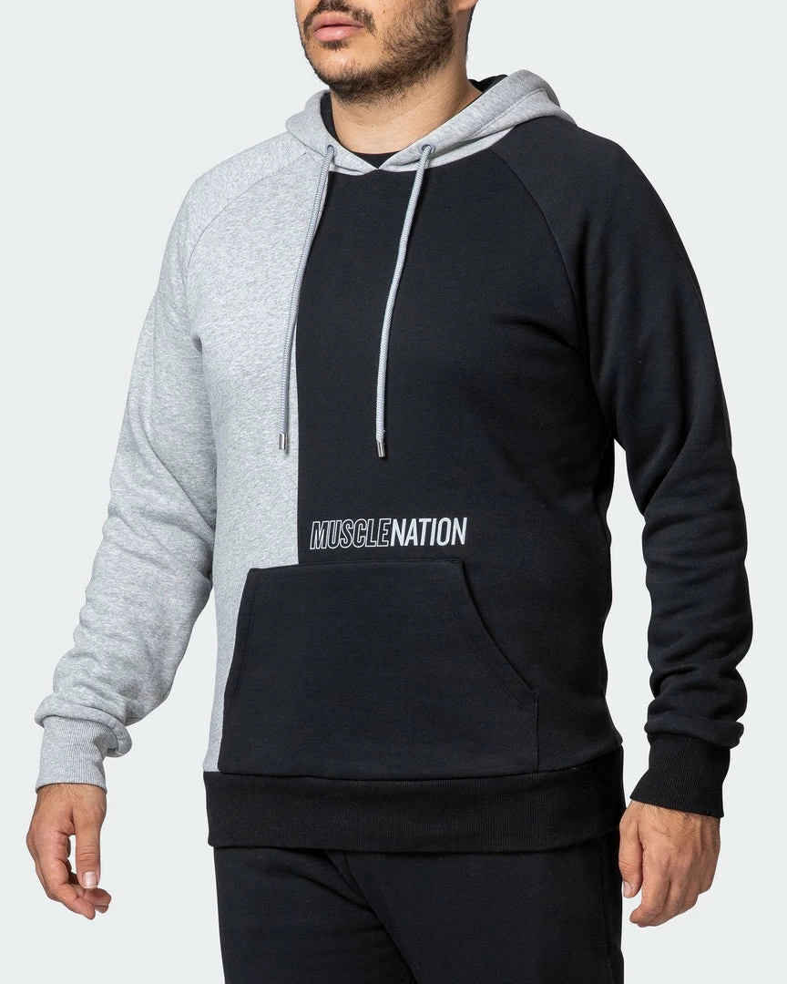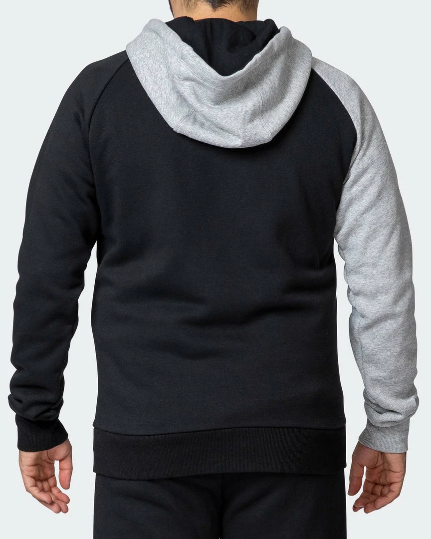 Details include a front patch pocket, ribbed trims, and contrast colour body and sleeve panels.