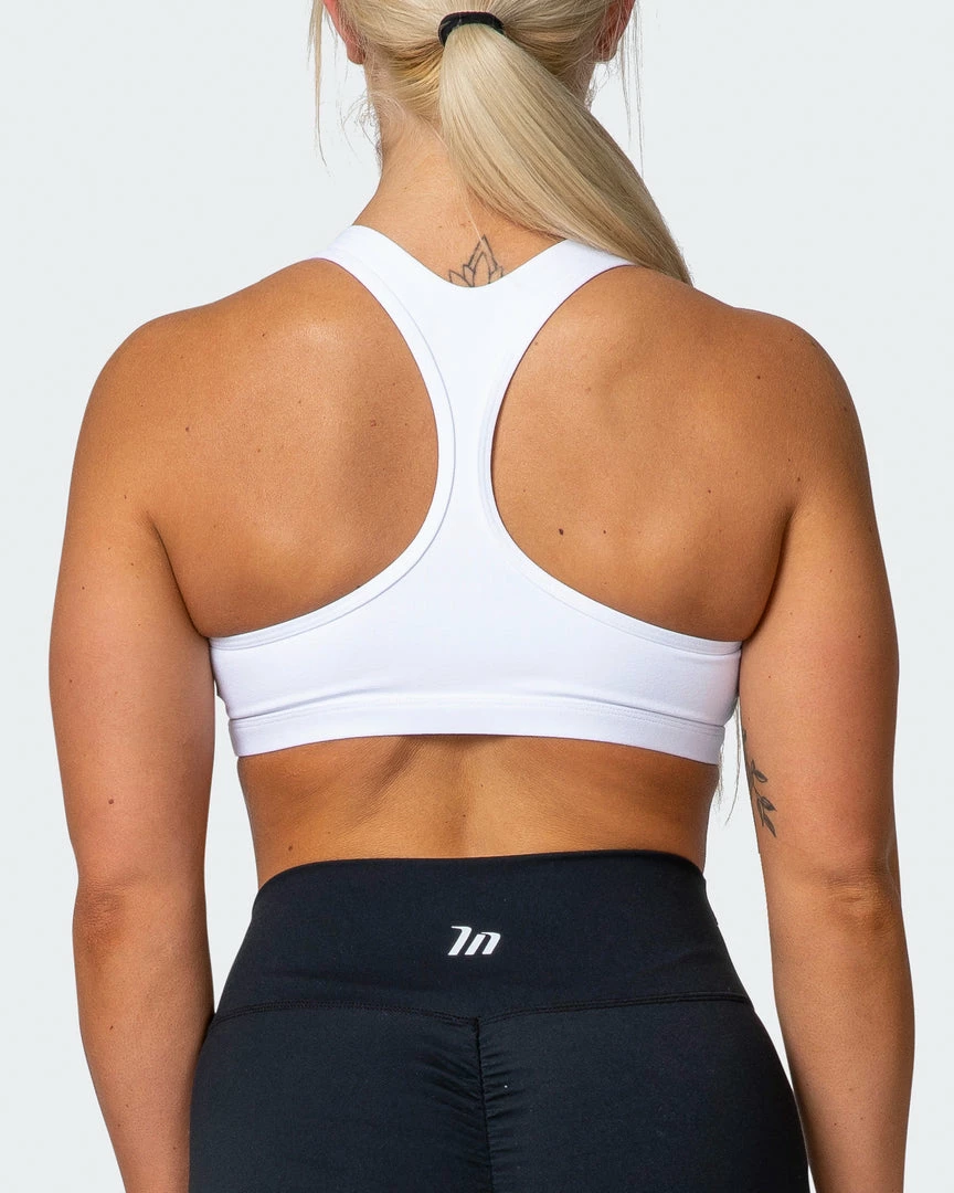 Notable features of the Flex Bra include a narrow racer back design, subtle square neckline and encased elastic waistband.