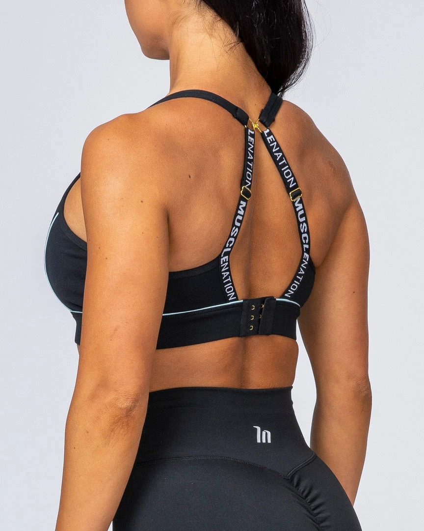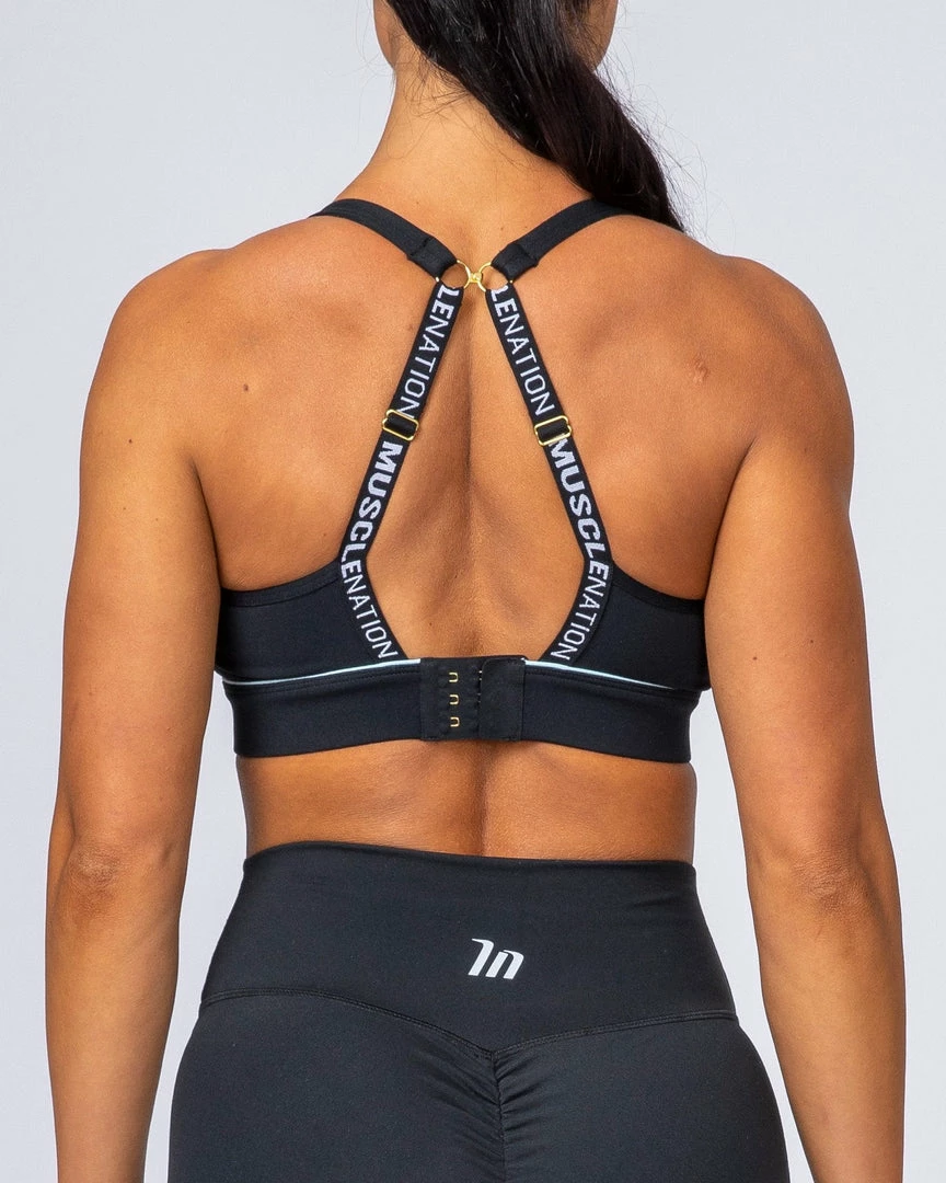 Details include luxe gold hardware, contrast piping and a customised Muscle Nation logo woven into the elastic back straps.Â