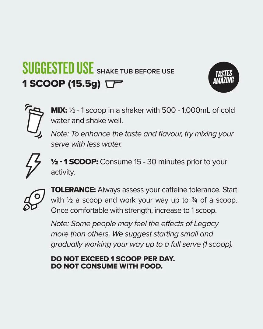 Note: Some people may feel the effects of Legacy more than others. We suggest starting small and gradually working your way up to 1 scoop (1 serve).