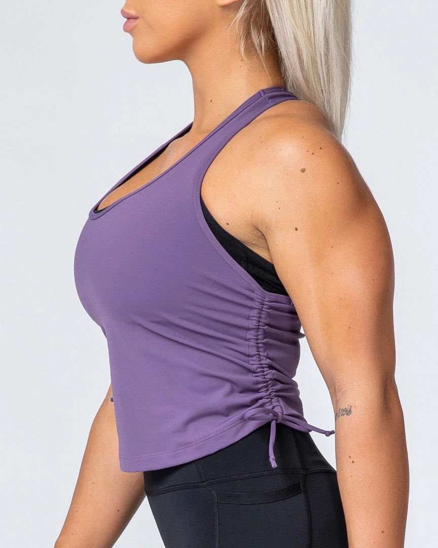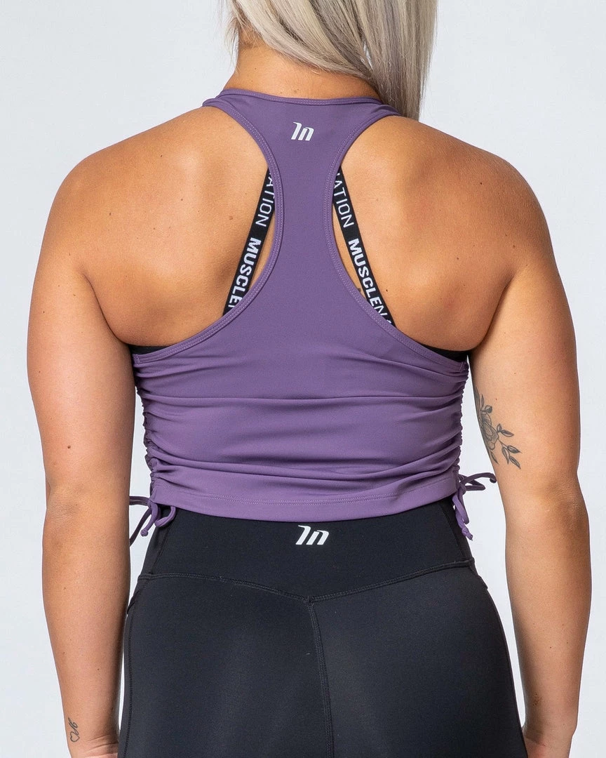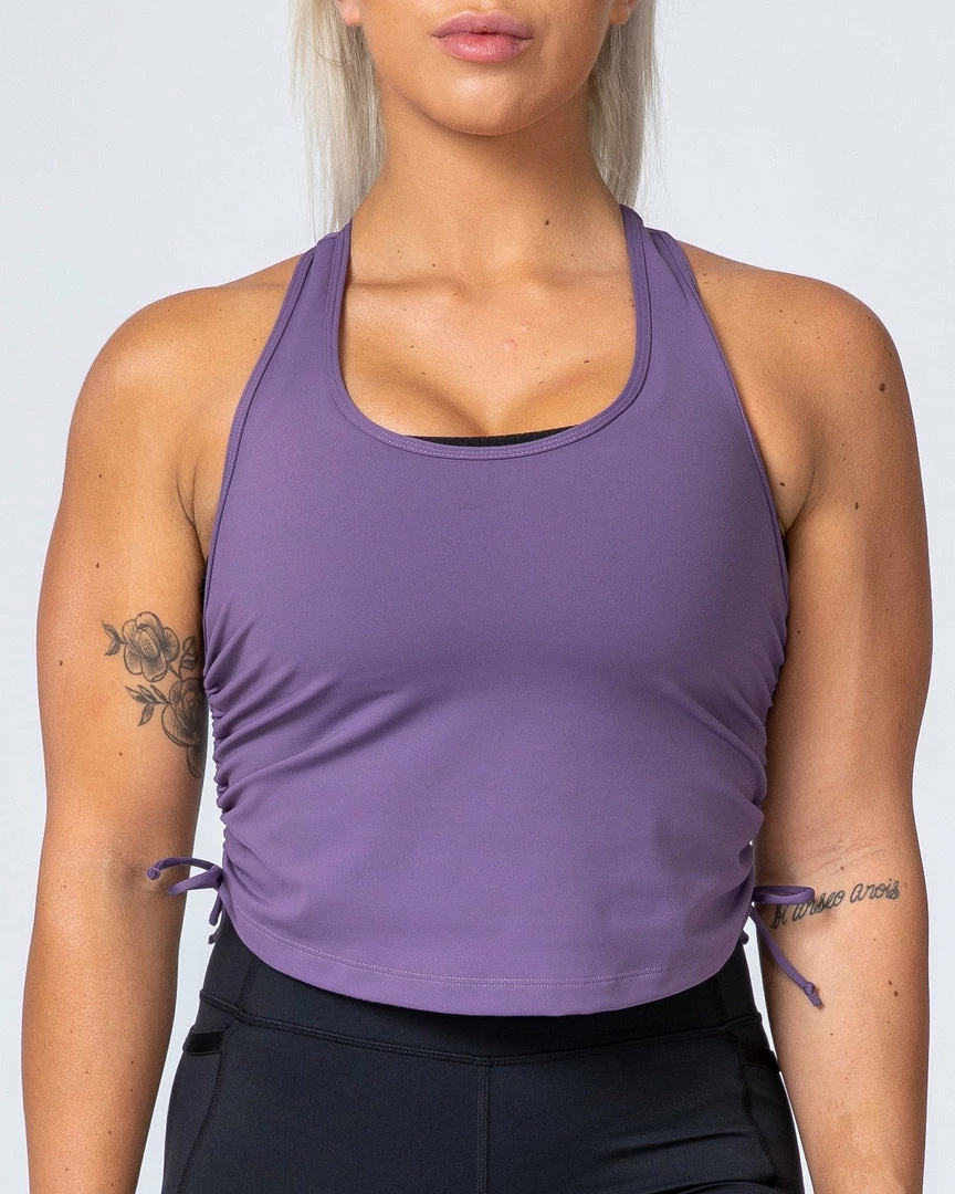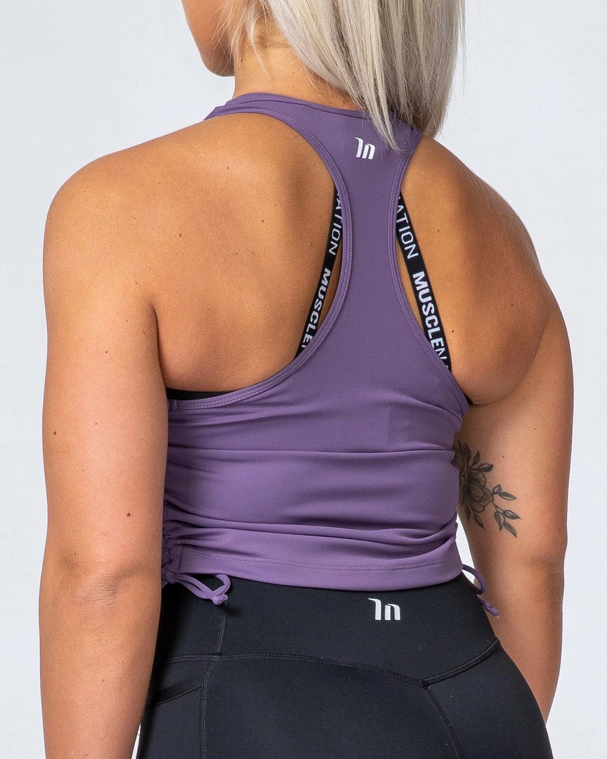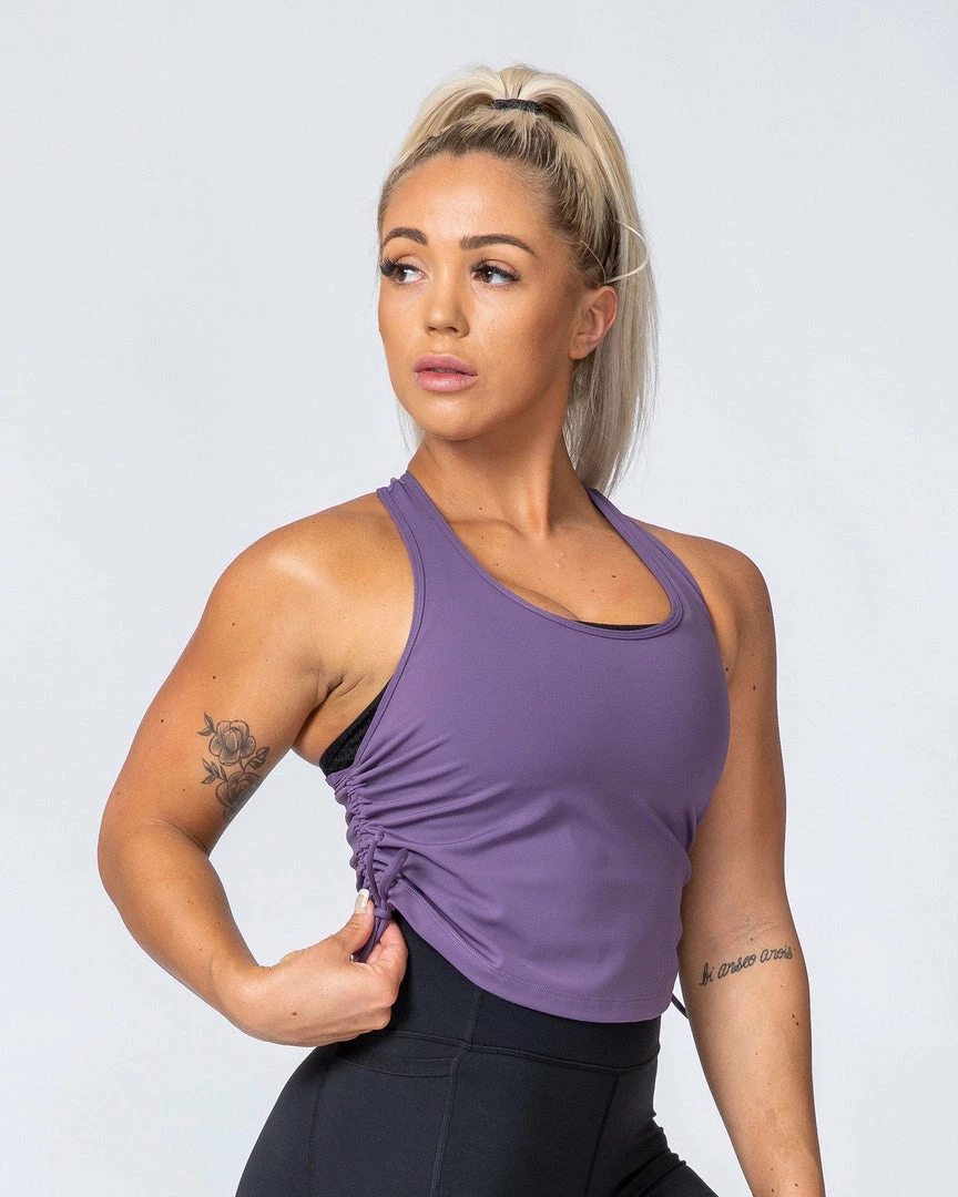Using the ruched side ties, you can adjust the length higher for more of a cropped look.